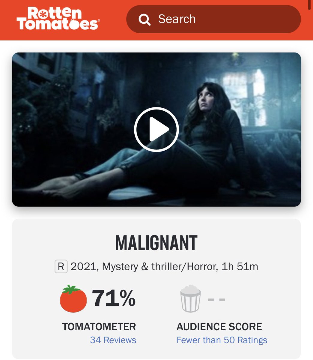 63 votes 50 comments. With 29 reviews at the time of this. The Rotten Tomatoes score for James Wan s new film Malignant is out and while its no Shang-Chi its certainlynice.
